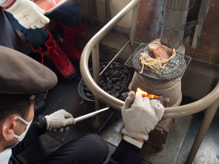 続いてレトロな「ストーブ列車」に乗車し、だるまストーブのぬくもりと冬景色を楽しみながら「ストーブ弁当」を味わいます。
