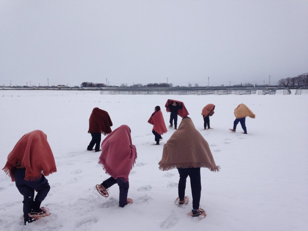 その後は、昔ながらの防寒具で挑む「地吹雪体験」。
